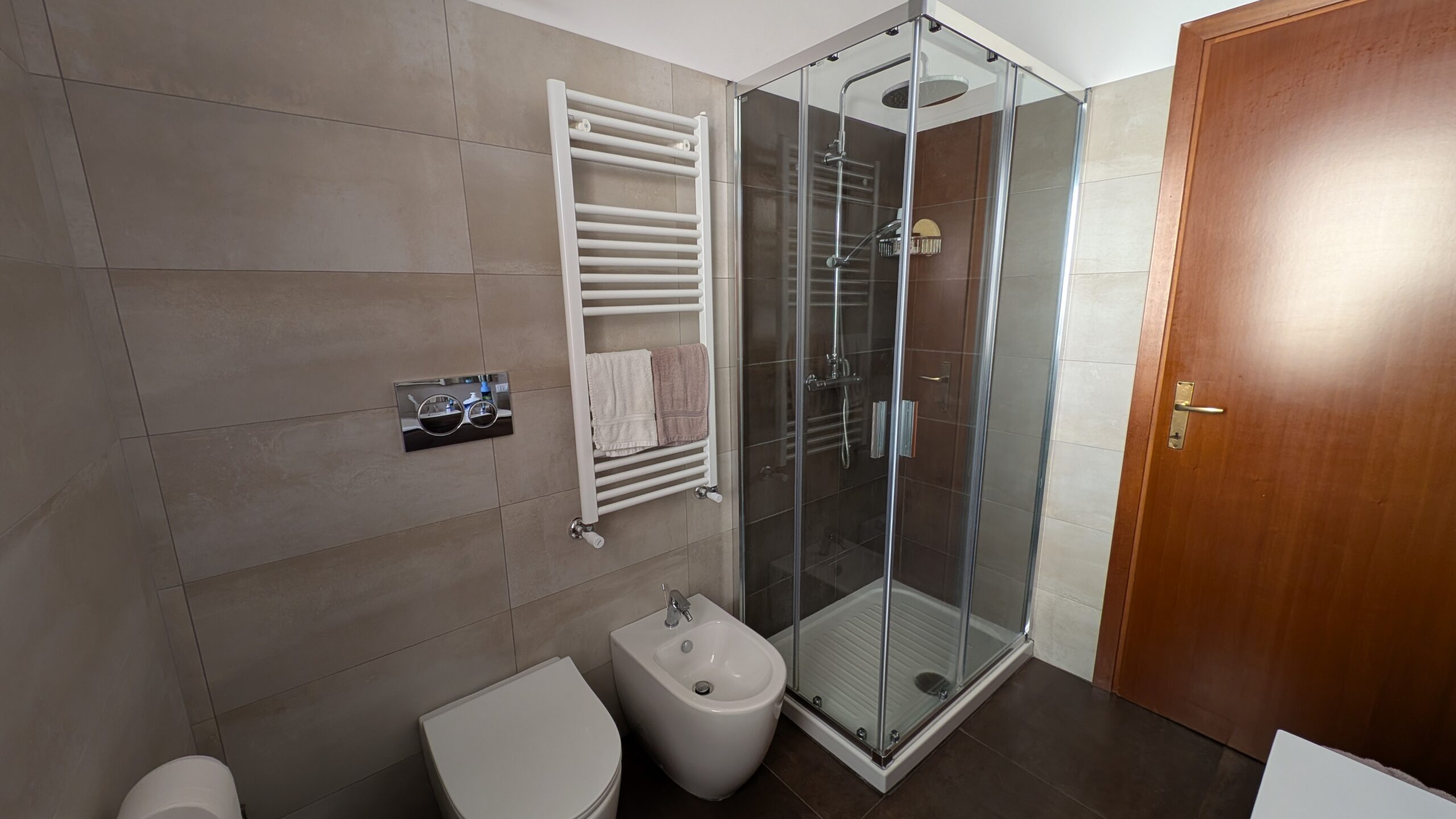 Entra nel nostro bagno, un ambiente funzionale e curato nei dettagli, pensato per offrirti momenti di piacevole relax e praticità durante il tuo soggiorno a Ladispoli.